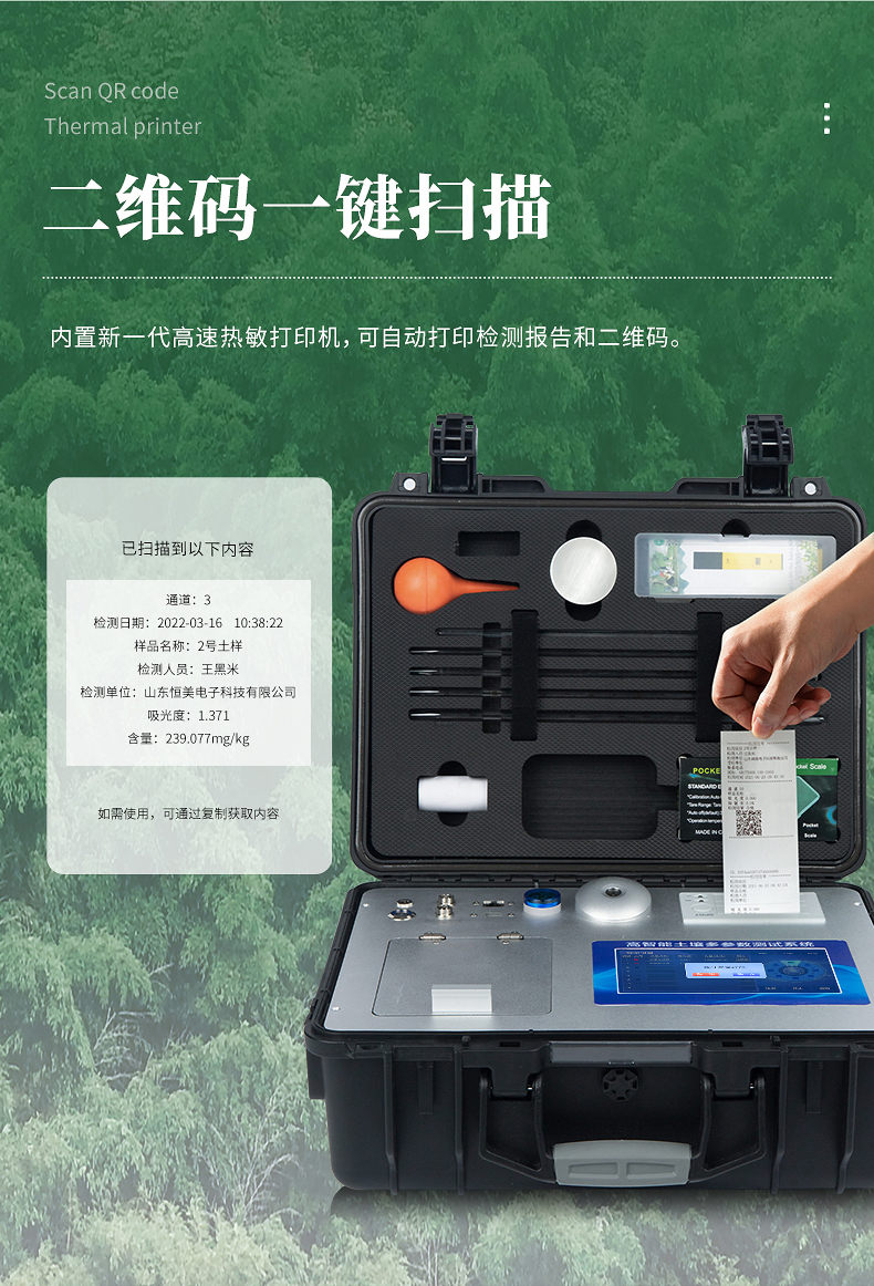 ★21、內置新一代高速熱敏打印機(無需色帶),打印內容包含:檢測單位、檢測人員、檢測項目、通道號、吸光度、養(yǎng)分含量(mg/kg)、檢測時間、以及二維碼等信息