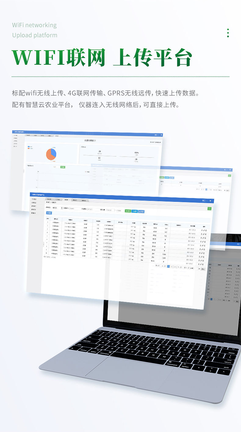★13、配有智慧云農(nóng)業(yè)平臺,儀器連入無線網(wǎng)絡后,可將檢測數(shù)據(jù)可選擇性或批量無線上傳,方便用戶進行數(shù)據(jù)管理和長期分析。