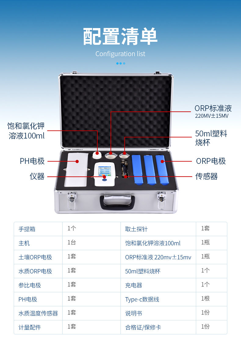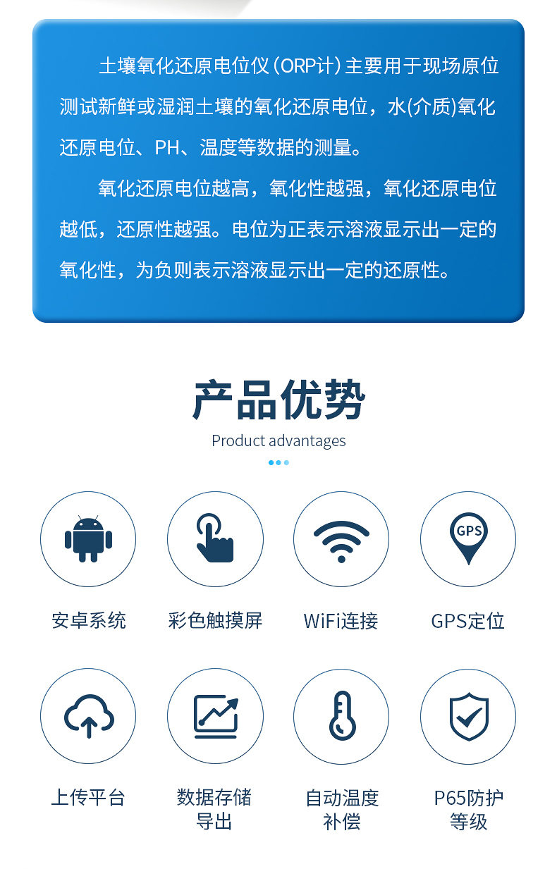 土壤氧化還原電位儀(ORP計)主要用于現場原位測試新鮮或濕潤土壤的氧化還原電位,水(介質)氧化還原電位、PH、溫度等數據的測量。符合《HJ746-2015土壤氧化還原電位的測定電位法》標準。