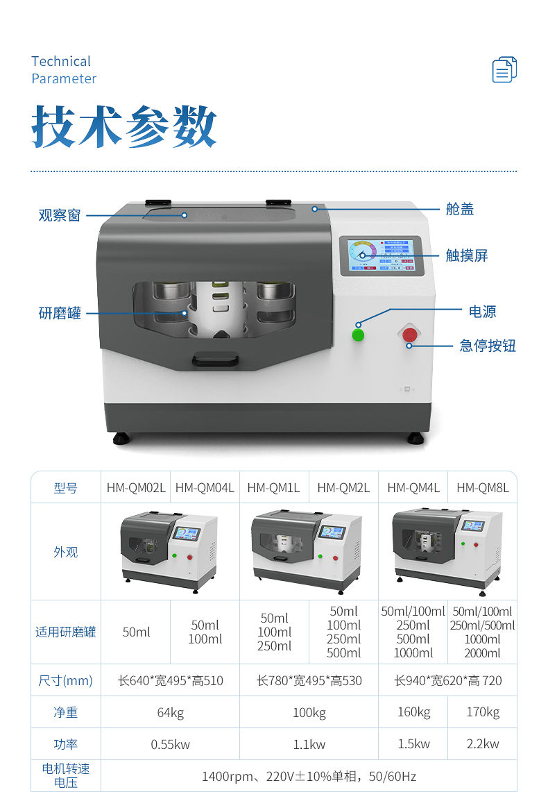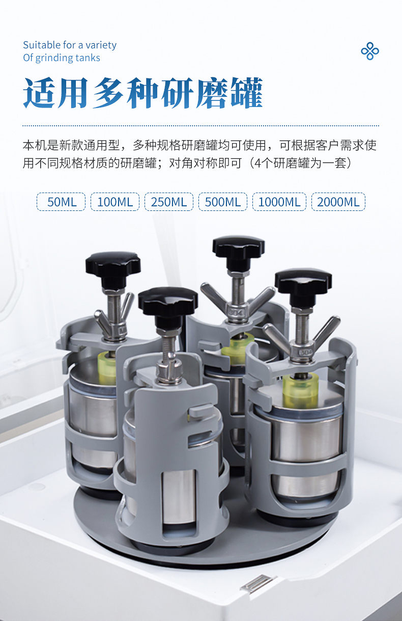 1. 適用研磨罐:本機(jī)是新款通用型,100ml、250ml三種規(guī)格研磨罐均可使用,可根據(jù)客戶需求使用不同規(guī)格材質(zhì)的研磨罐;對(duì)角對(duì)稱即可(4個(gè)研磨罐為一套)。