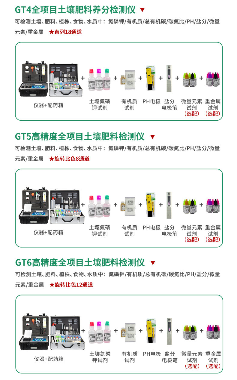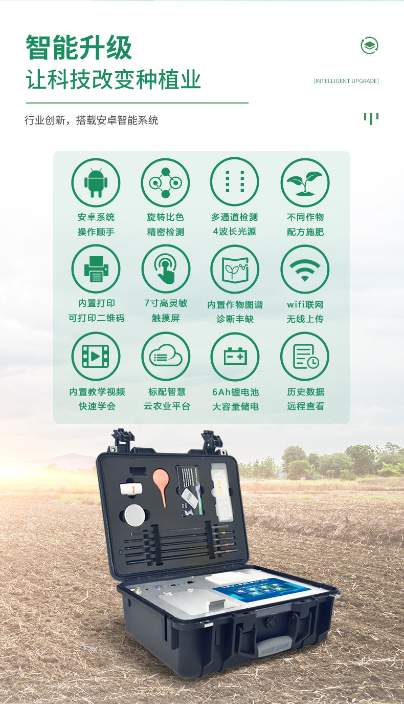 配套齊全:該儀器集藥、器、儀為一體,攜帶方便,相當(dāng)于一個(gè)小型移動(dòng)實(shí)驗(yàn)室,無(wú)需用戶自配附件,亦可靈活野外流動(dòng)測(cè)試。適于農(nóng)業(yè)服務(wù)部門或農(nóng)資經(jīng)銷商、高教院校、科研院所、合作社、肥料廠商、大種植戶測(cè)土施肥和鑒別肥料真假及環(huán)保檢測(cè)應(yīng)用。