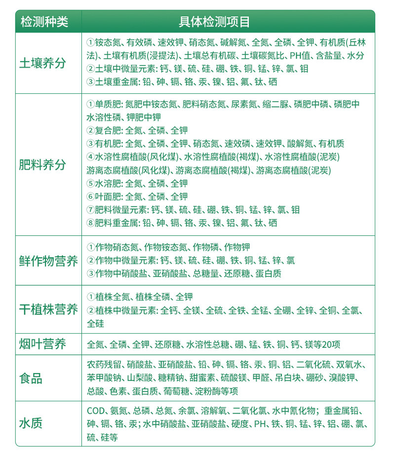 2、肥料養(yǎng)分:●單質(zhì)肥:氮肥中銨態(tài)氮、肥料硝態(tài)氮、尿素氮、縮二脲、磷肥中磷、磷肥中水溶性磷、鉀肥中鉀;●復(fù)合肥全氮、復(fù)合肥全磷、復(fù)合肥全鉀;●有機(jī)肥全氮、有機(jī)肥全磷、有機(jī)肥全鉀、有機(jī)肥硝態(tài)氮、有機(jī)肥速效磷、有機(jī)肥速效鉀、有機(jī)肥酸解氮、有機(jī)質(zhì);●水溶性腐植酸(風(fēng)化煤)、水溶性腐植酸(褐煤)、水溶性腐植酸(泥炭)、游離態(tài)腐植酸(風(fēng)化煤)、游離態(tài)腐植酸(褐煤)、游離態(tài)腐植酸(泥炭);●水溶肥全氮、水溶肥全磷、水溶肥全鉀;●葉面肥全氮、葉面肥全磷、葉面肥全鉀;●各種肥料微量元素:肥料鈣、肥料鎂、肥料硫、肥料硅、肥料硼、肥料鐵、肥料銅、肥料錳、肥料鋅、肥料氯、肥料鉬;●肥料重金屬:肥料鉛、肥料砷、肥料鎘、肥料鉻、肥料汞、肥料鎳、肥料鋁、肥料氟、肥料鈦、肥料硒。